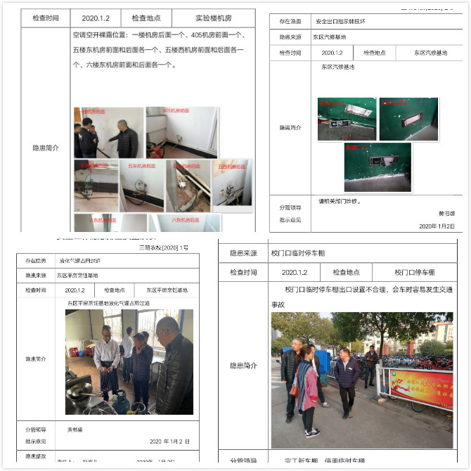 四、保卫处6名人员分散到各个小组,配合各小组检查。重点检查了消防、交通等安全风险隐患排查,及时对发现问题建立清单,通知整改部门。