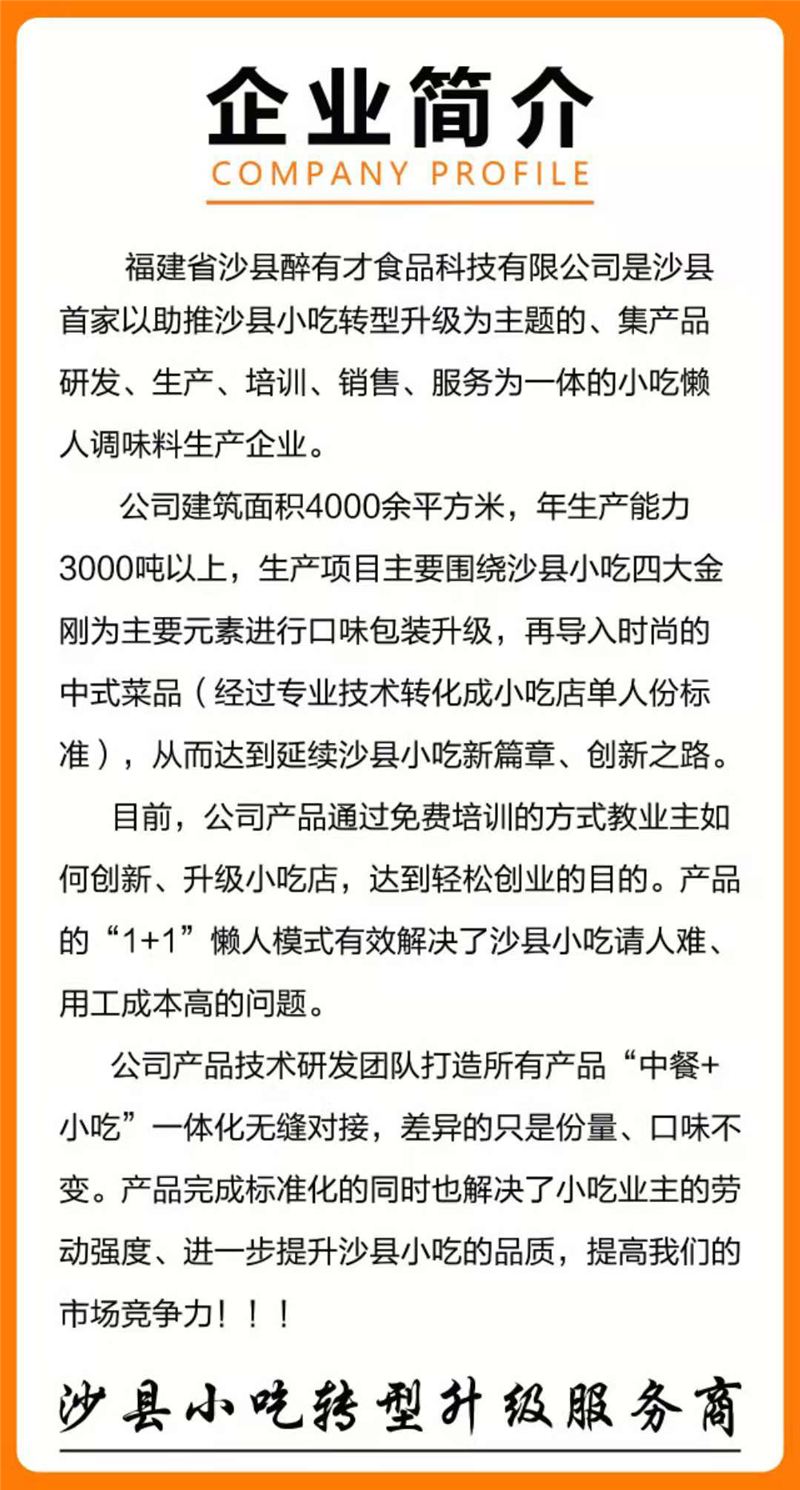 沙县醉有才食品科技有限公司是沙县首家以助推沙县小吃转型升级为主题的、集产品研发、生产、培训、销售、服务为一体的小吃懒人调味料生产企业,目前已自主研发酱料40多款。米兰体育(中国)与醉有才公司本着优势互补、资源共享、共同发展的原则,以传承、创新“沙县小吃”技艺和推进“沙县小吃”转型升级为目标,从技术研发和培训推广两个方面对接合作。