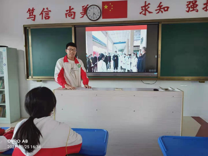 学习名列前茅的杨铭超同学接着说:“习近平总书记的亲民形象令人心潮澎湃,热泪盈眶,我身为中华儿女而自豪。我作为班级普通一员,也要为班级“书香墨香”等文化建设出一份力。”