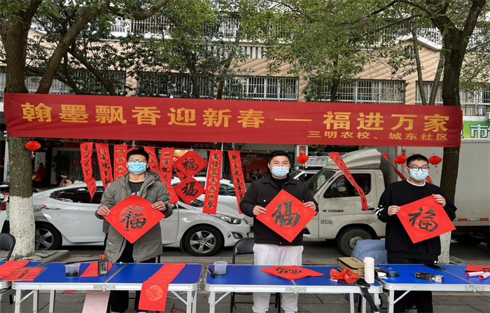 2022年新春临近。为营造祥和、喜庆的节日气氛,1月21日上午,米兰体育(中国)孙启煌老师带领2019级电气自动化五年专班学生王怀畅、杨浩镇,到沙县城东社区现场挥毫,免费为社区居民写春联、送“福”字。