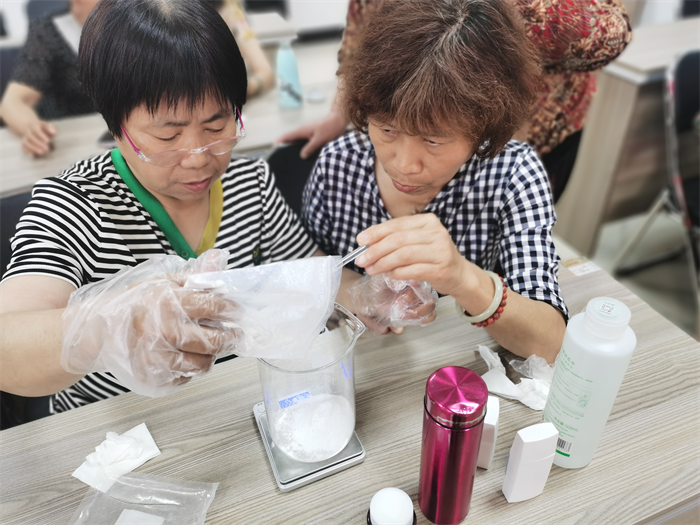 根据学校服务全民终身学习、服务社区工作安排,张静老师从上学期开始承担长富社区“乐龄学堂”《美丽手作》课程教学,每月坚持到社区授课一次。她先后手把手传授了香薰拓片、口红、防晒霜、手工皂等制作方法,每件成品既实用又赏心悦目,让学员充分体验了“美”的创造过程,教学现场总是充溢着香甜的气息,洋溢着学员们欢欣的笑容。