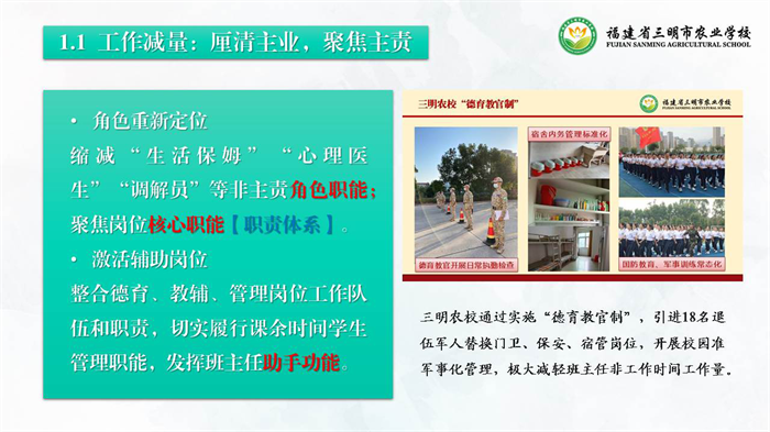 论坛上,我校思政处主任林宏宇以《减负、增能、赋权——优化中职班主任工作的学校路径》为题作主旨发言。他从学校管理视角,提出通过减负、增能和赋权等方法,让班主任有位、善为,助力班主任管理。通过聚焦主责,配好帮手,实现工作减量;通过人文关怀、全员共育,实现管理减压;通过减少留痕,数字赋能,实现流程减化。从思政增能,让班主任有位;从管理增能,促班主任善为;从团队增能,助班主任发展。从团队、责任、目标三个方面实现班级建设召集权、班级管理自主权和职级晋升发展权。