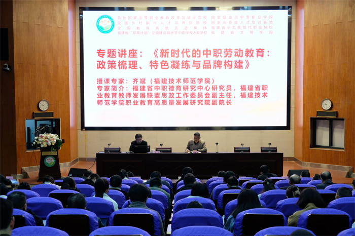福建省中职德育研究中心研究员,福建省职业教育教师发展联盟思政工作委员会副主任,福建技术师范学院职业教育高质量发展研究院副院长齐斌为研修学员们带来了题为《新时代的中职劳动教育:政策梳理、特色凝练与品牌构建》的讲座。